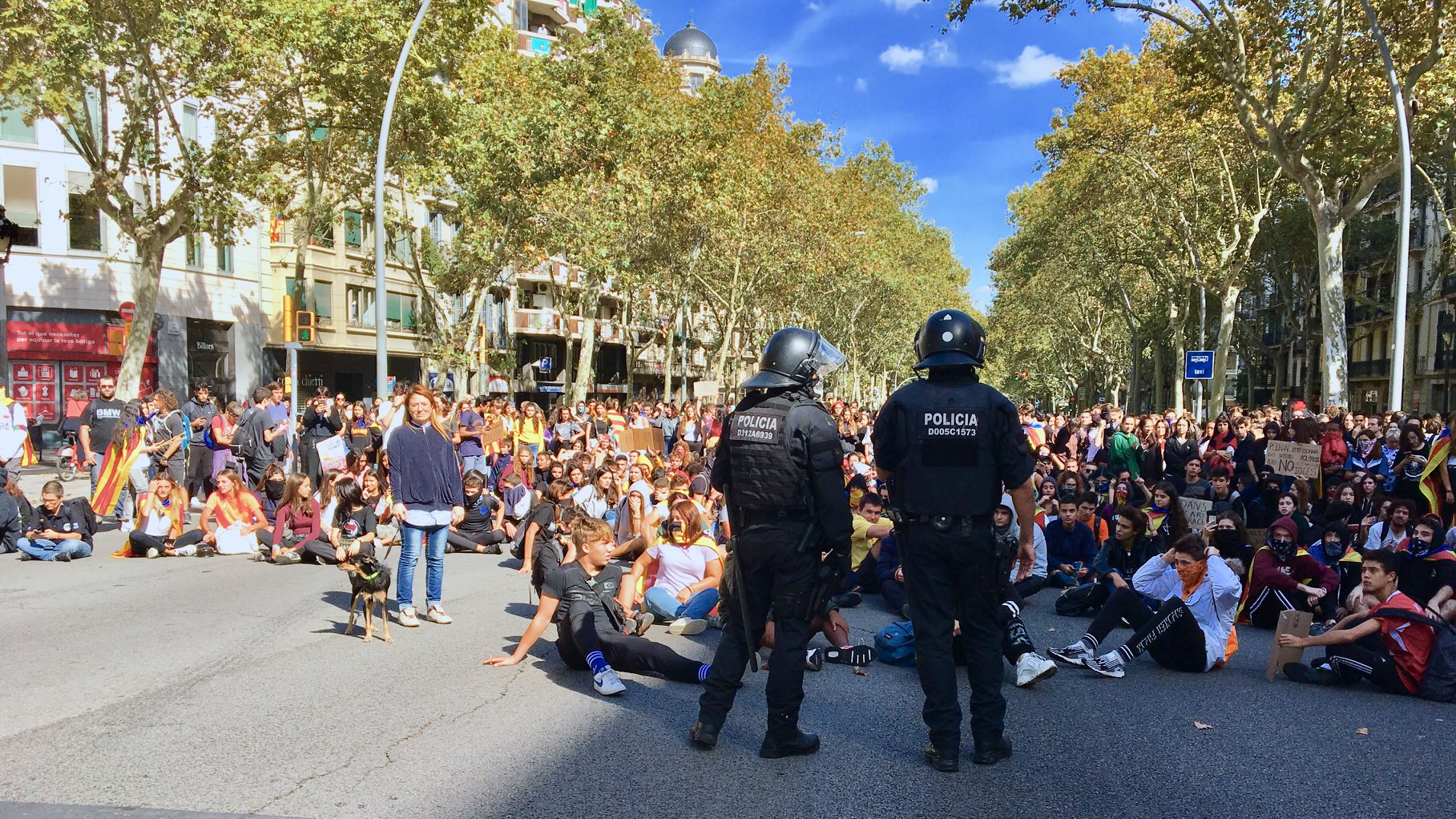 Aujourd’hui, les universités sont en grève et les jeunes jouent au chat et à la souris avec les « piolíns » (surnom donné aux agents de la garde civile depuis 2017 en référence au gigantesque Tweety Bird qui ornait le bateau affrété pour héberger les policiers durant le référendum).